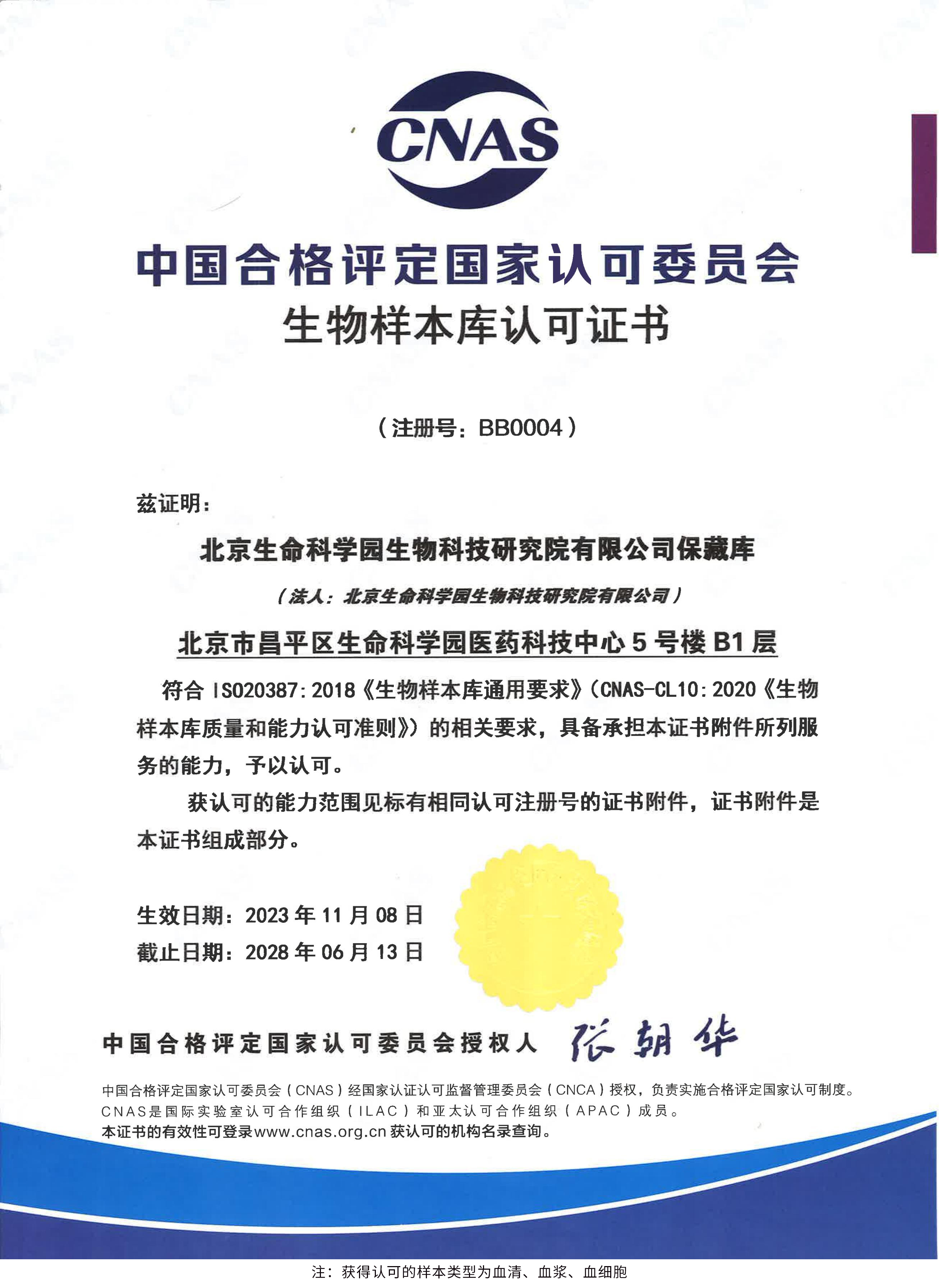 北京生命科學園生物科技研究院(以下簡稱“北京生物樣本資源庫”)(Biobank of Life Science Park,簡寫“BoLSP”)是一家由北京市科委和中關村生命科學園共同支持設立的第三方生物樣本庫公共服務平臺,秉承北京重大疾病臨床數(shù)據(jù)和樣本資源庫(以下簡稱“北京庫”)(Beijing Biobank of Clinical Resources,BBCR)十余年的發(fā)展成果,聚合眾多臨床樣本專家的專業(yè)共識,致力于在生命科學、生物醫(yī)藥研究領域發(fā)揮銜接樣本資源持有者與研究者的橋梁作用,解決生物樣本資源開發(fā)上下游信息不對稱、資源共享困難等問題。研究院在北京中關村生命科學園昌平園區(qū)建立了2000㎡生物樣本庫,最大存儲規(guī)模達1000萬份。研究院遵循CNAS-CL10:2020《生物樣本庫質(zhì)量和能力認可準則》,同時結(jié)合北京庫過去十年的工作經(jīng)驗與教訓,建立了一套完善的生物樣本保藏質(zhì)量管理體系,從人、機、料、法、環(huán)、控多個角度,實現(xiàn)生物樣本保藏過程的全面質(zhì)量控制,先后獲得國家科技部頒發(fā)的人類遺傳資源保藏行政許可證書和中國合格評定國家認可委員會(China National Accreditation Service for Conformity Assessment,CNAS)頒發(fā)的“CNAS認可證書”。